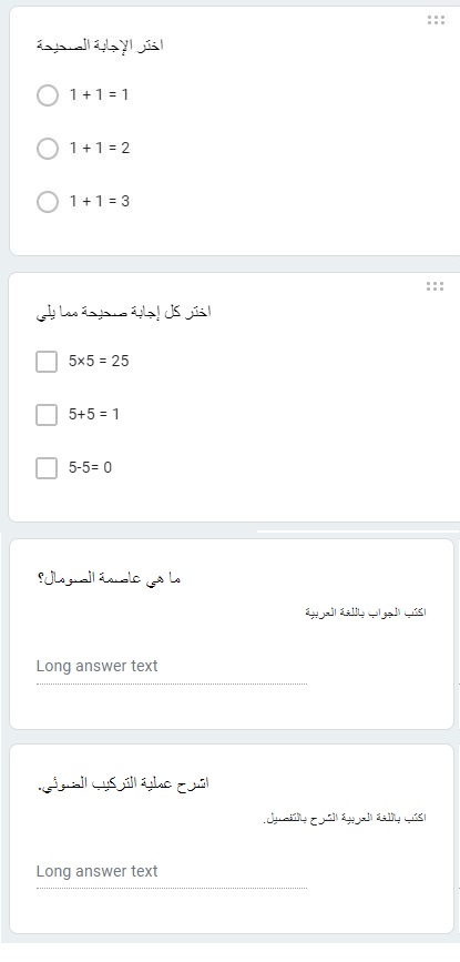 بشكل عام هذه الأداة ليست مخصصة للاختبارات فحسب، بل يمكن استخدامها للكثير من الأمور منها استطلاعات الرأي، لكن مع وجود خيارات متعددة لطريقة الإجابة عن الأسئلة المطروحة يمكن استخدامها كأداة صنع اختبارات بفعالية.
